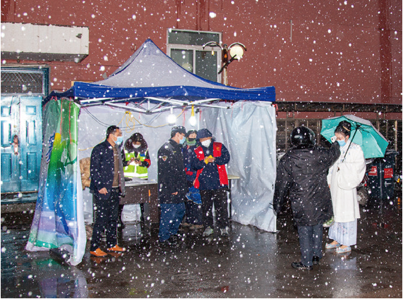 2020年2月27日晚,在河北省邯郸市复兴区百家街道钢三社区,社区工作人员坚守岗位。