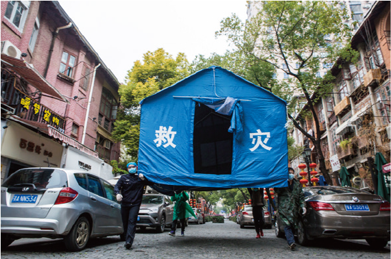 Volunteers move a tent in Lihuangpi Road, Jiang'an District, Wuhan, Hubei Province, on February 26, 2020.