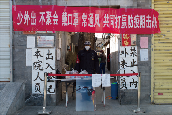 2020年2月18日,北京市一社区入口,一名保安坚守岗位。