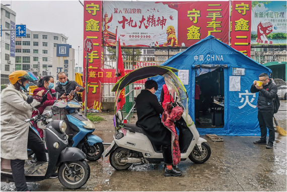 2020年2月26日,湖北省武汉市江岸区黎黄陂路,志愿者搬移帐篷。