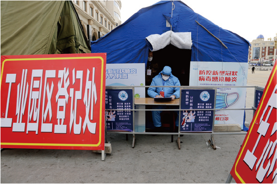 A tent of Beicheng Industrial Park to meet its workers arriving at the railway station in Baicheng City, Northeast China's Jilin Province, on February 15, 2020.