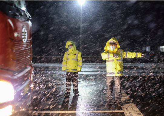 2020年2月15日晚,江苏省邳州市一处高速出口卡点,市公安局交警、巡防民警顶风冒雪在路边就餐。