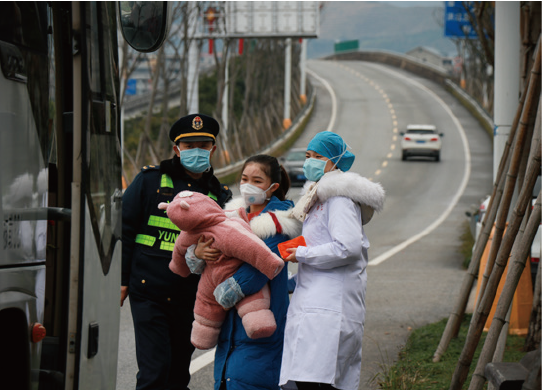 2020年1月26日,湖南省怀化市靖州苗族侗族自治县一处高速路口,运政、医院、公安等部门的工作人员联合对乘客进行检查,一名怀抱婴儿的女子接受检查后登车准备回家。