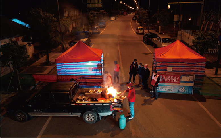2020年2月19日夜,浙江省余姚市凤山街道五星村防疫卡点,一名村民用“流动厨房”为志愿者做夜宵,以这种特别的方式温暖战“疫”人员。