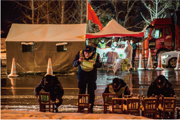Traffic police and police patrol officers eat a meal in the open area when they are on duty at a checkpoint in Pizhou City, Jiangsu Province, on February 15, 2020.