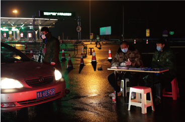 Traffic police officers on duty at an anti-epidemic checkpoint in Guanyun County, Lianyungang City, Jiangsu Province, on February 15,2020.