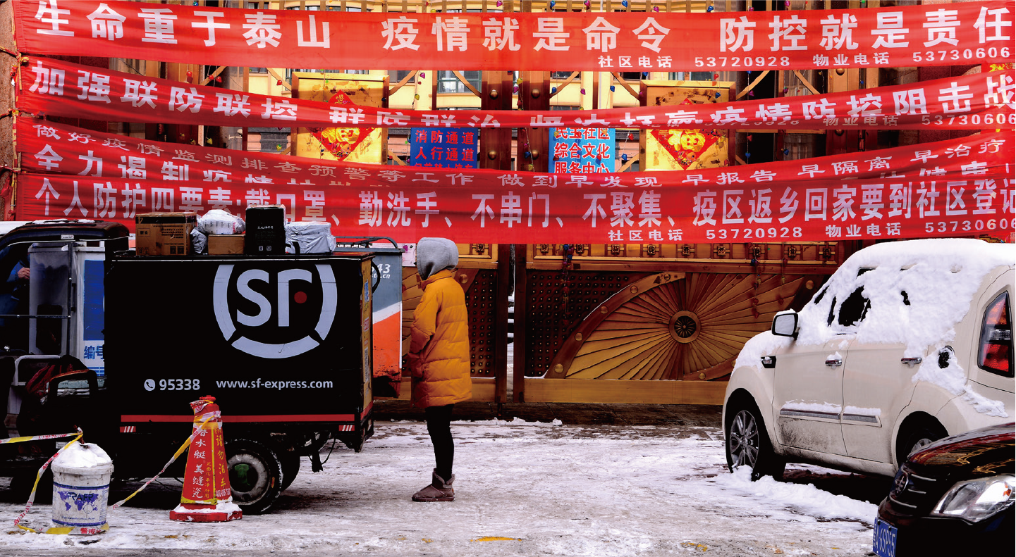 2020年2月23日,黑龙江省哈尔滨市阿城区一小区门口,快递人员不畏严寒,坚持送件。